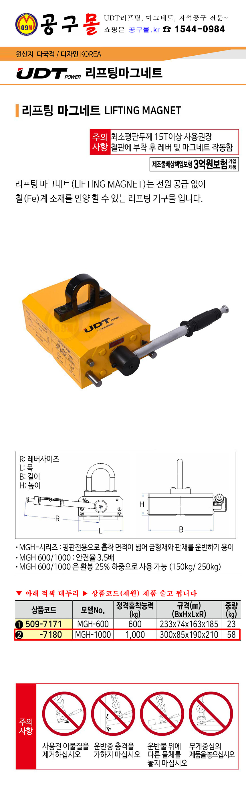 UDT 리프팅마그네트(평판) MGH-1000(1,000kg) UDT리프팅, 공구몰, 마크네트, 509-7180