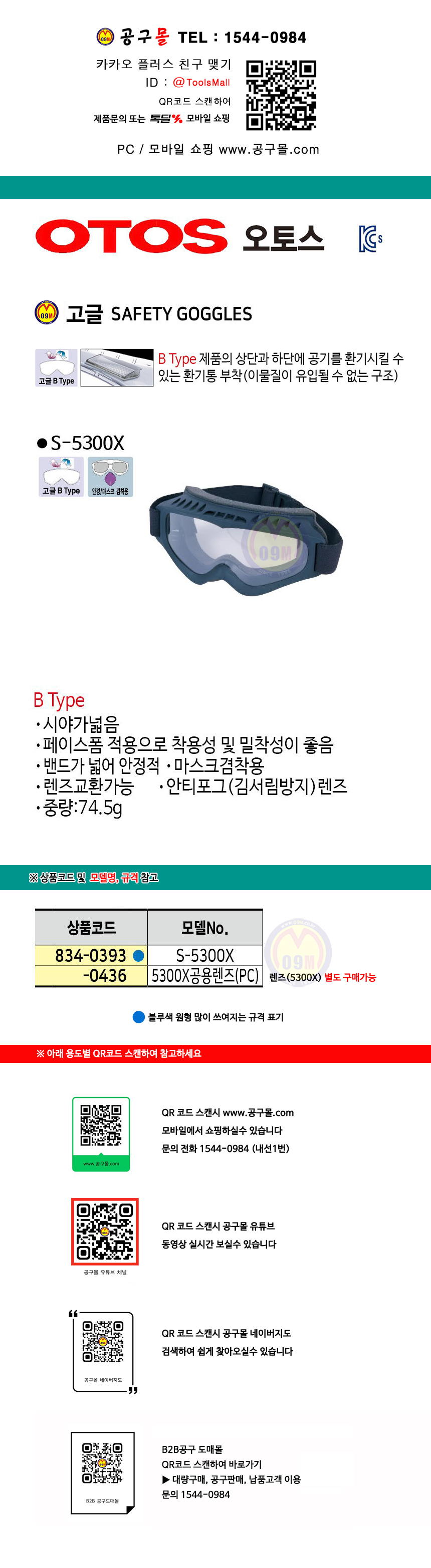 오토스 고글 보안경 S-5300X OTOS, 고글안경, 834-0393
