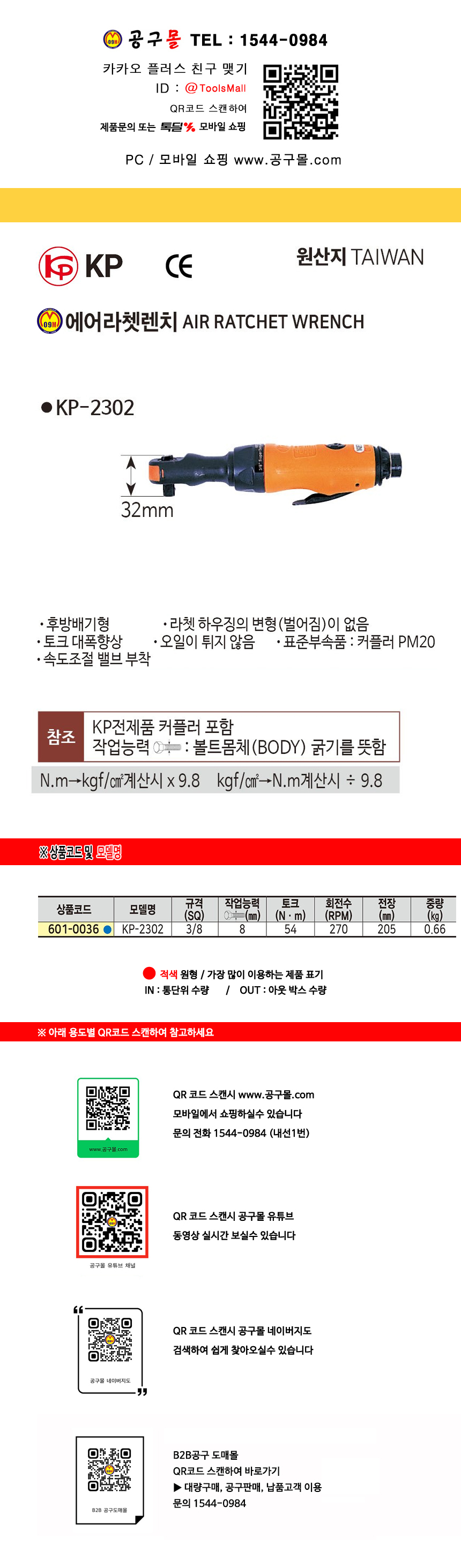 KP 에어라쳇트렌치 KP-2302 (3/8SQ) 에어공구, 에어라체트 공구몰 601-0036