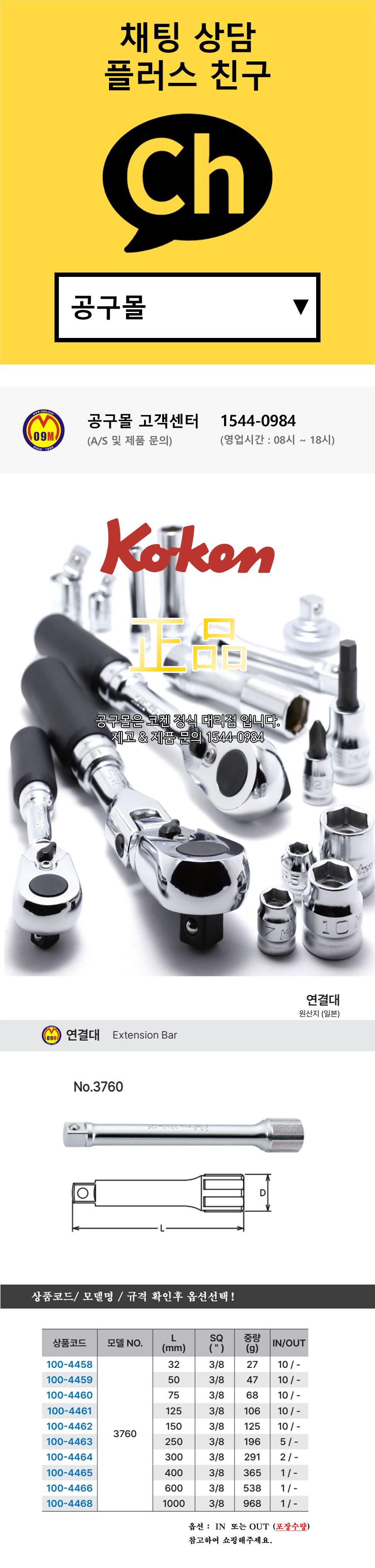 코켄 연결대(3760) 3/8x32mm-250mm KOKEN Extension Bar 공구몰 100-4461