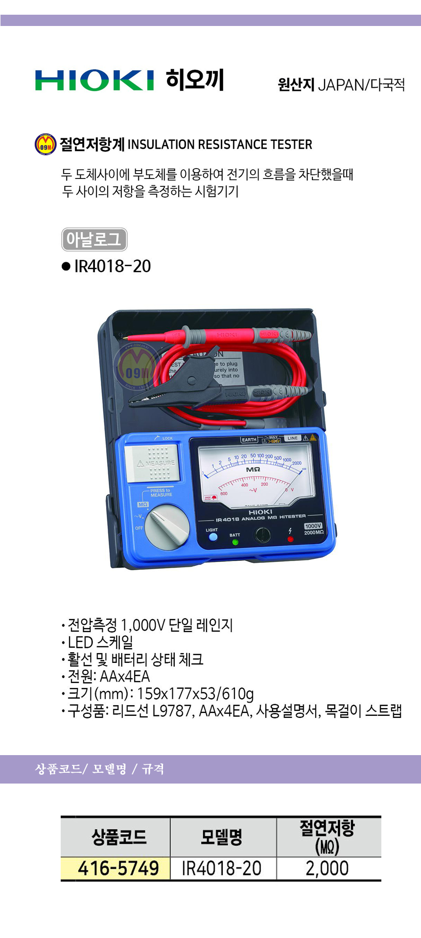 히오끼 절연저항계(아날로그) IR4018-20 HIOKI ,테스타기, 공구몰 416-5749