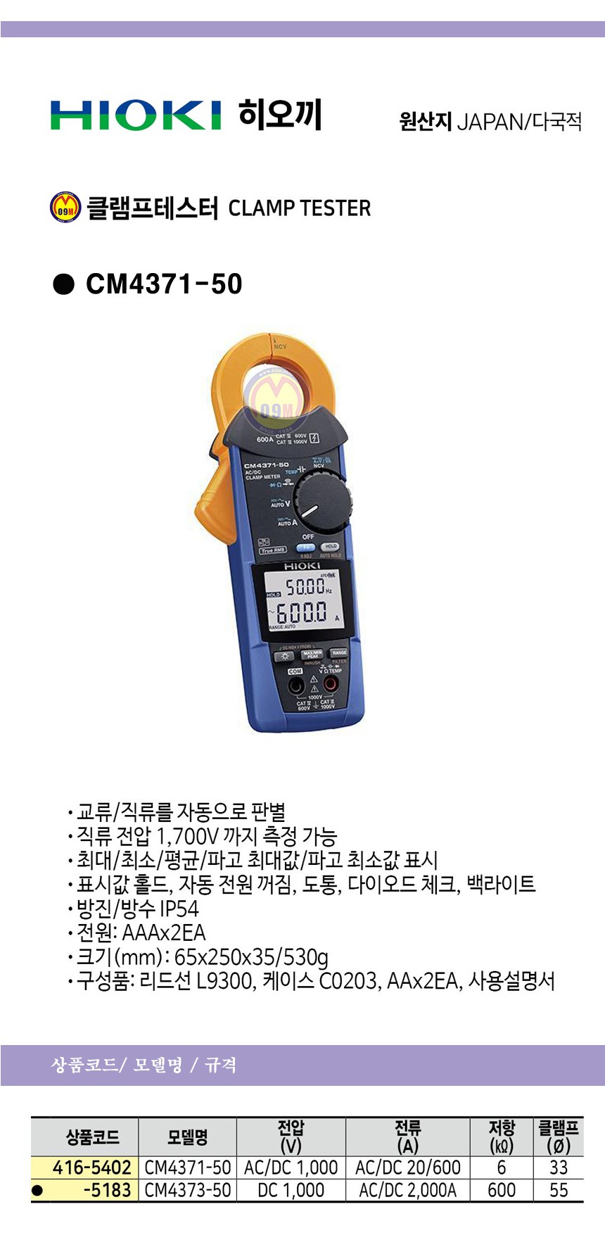 히오끼 클램프테스터(디지털) CM4371-50 (old.CM4371) HIOKI ,테스타기, 공구몰 416-5402
