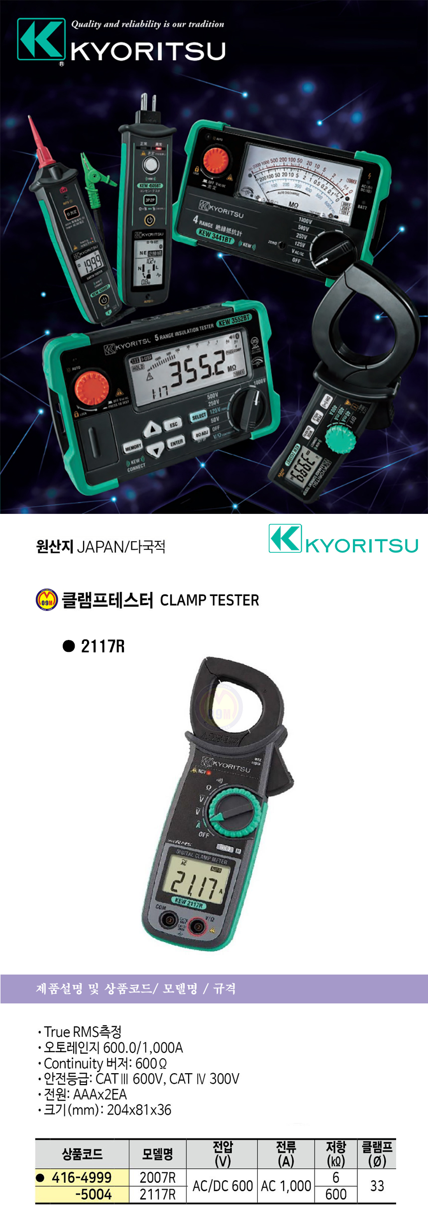 교리쯔 클램프테스터(디지털) No.2117R KYORITSU, 공구몰 416-5004
