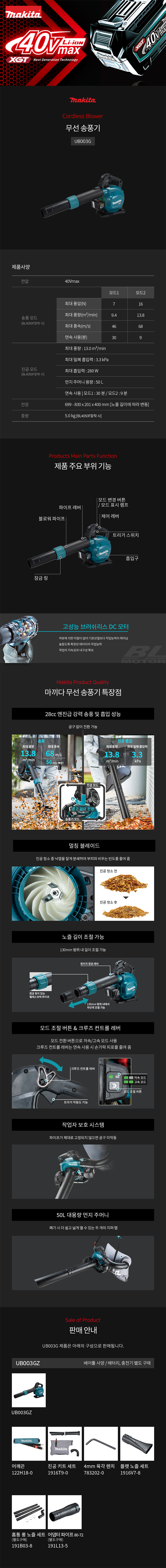 마끼다 충전송풍기 UB003G (40V-베어툴) 흡입 송풍 겸용 브로워 낙엽청소기