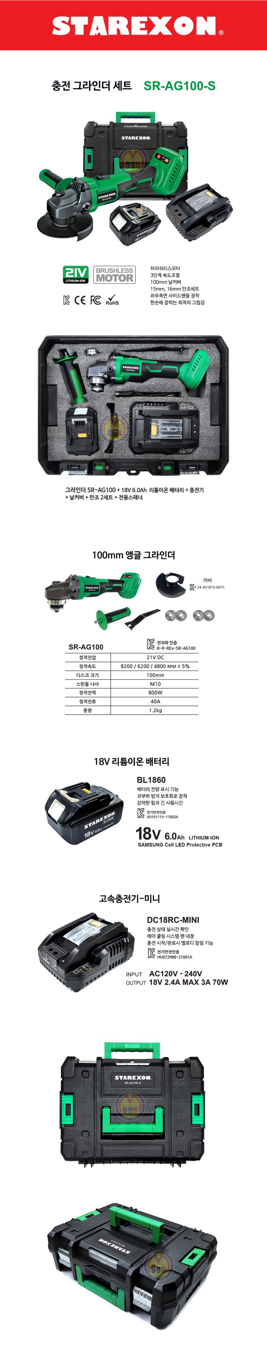 스타렉슨 충전그라인더세트 SR-AG100-S 18V 6Ah 1B (3속도) STAREXON