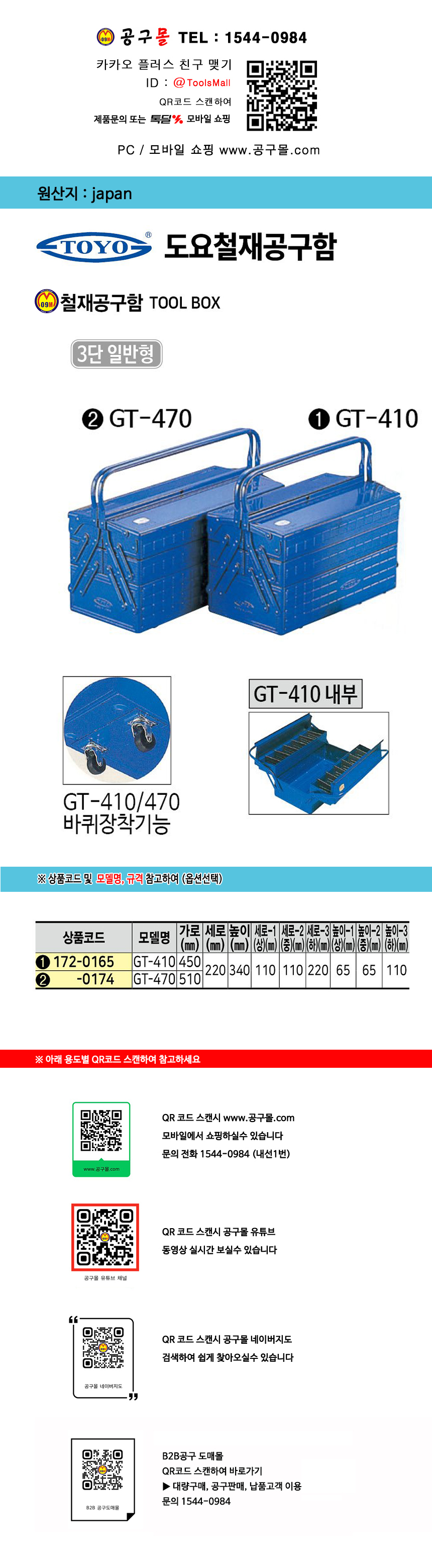 도요 철재공구함(3단일반) GT-410(3단), GT-470(3단) TOYO 일본산 공구함 172-0165