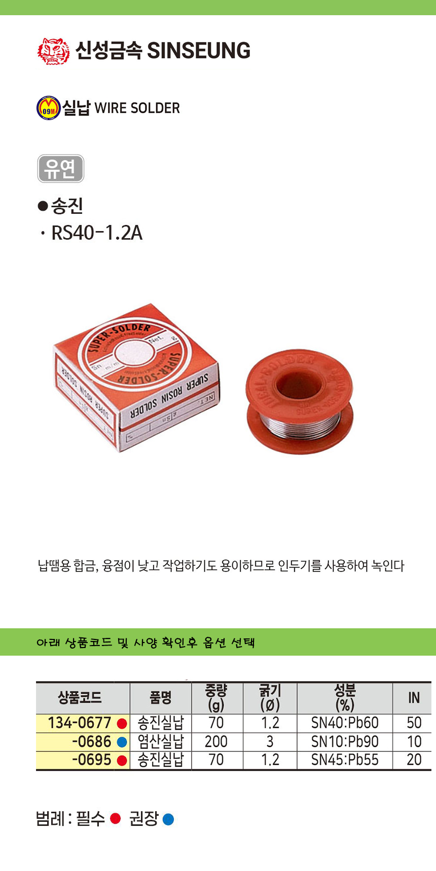 신성금속 실납(유연) 송진-70G-1.2mm (SN40, SN45) 송진실납, 납땜납, 인두납 , 공구몰 추천 134-0677