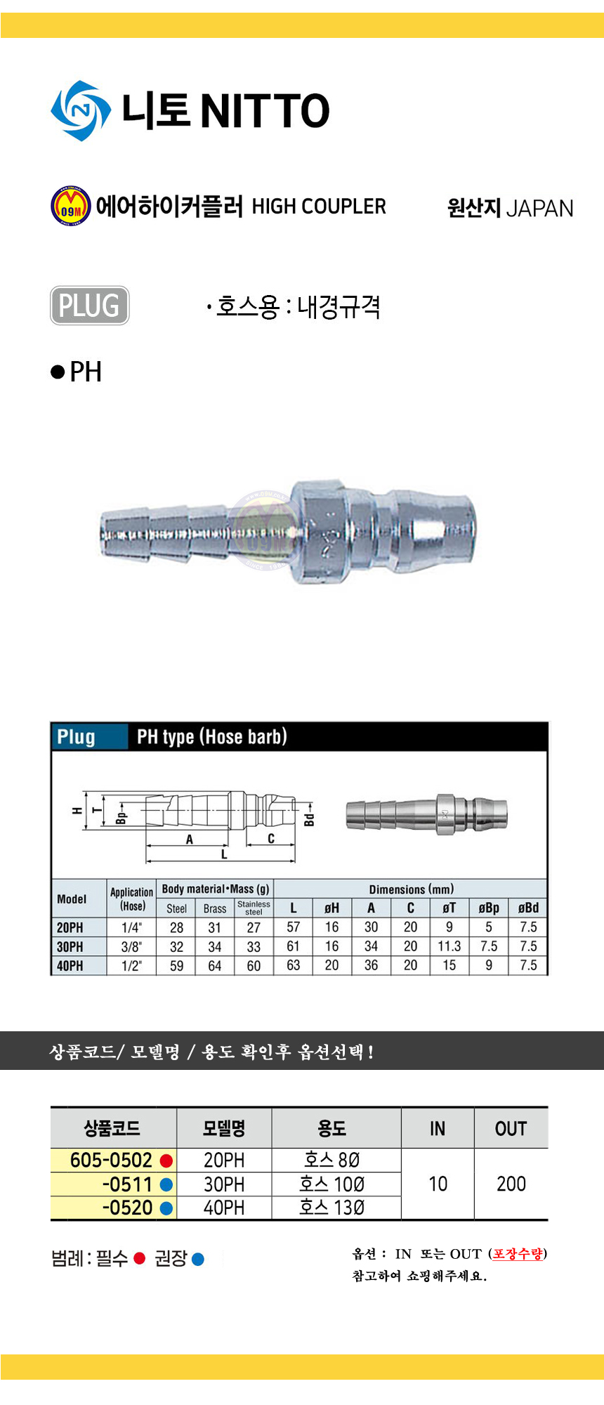 니토 하이커플러(PH) 20PH/ 30PH/ 40PH NITTO 공구몰 PLUG 605-0502