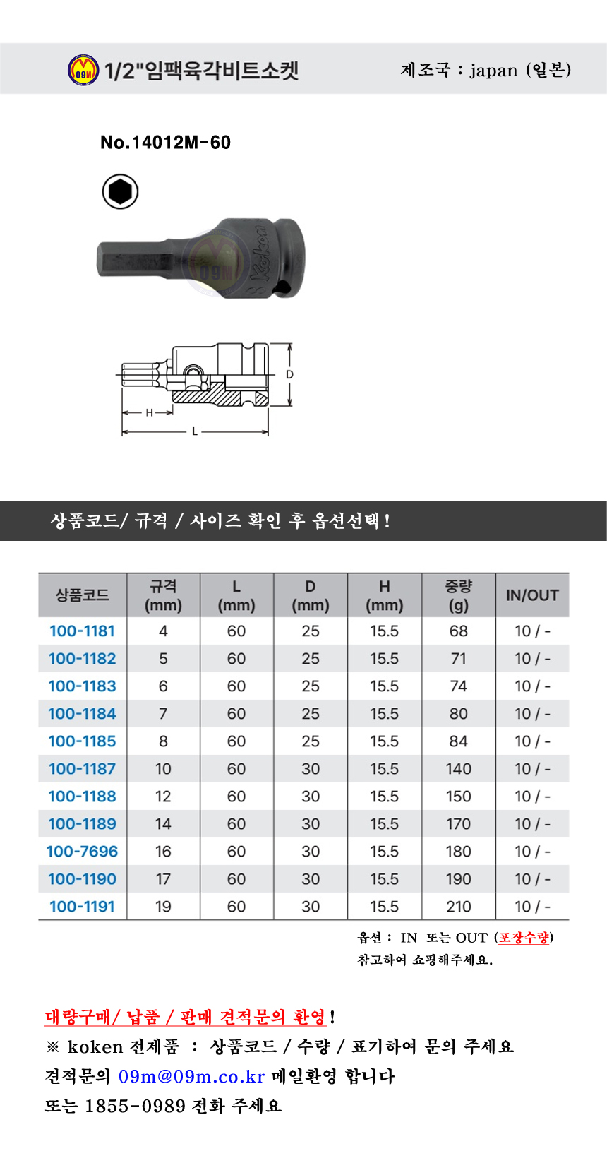 코켄 임팩육각비트소켓 14012M-60 1/2x(4mm 19mm) KOKEN, 육각헤드복스,100-1181