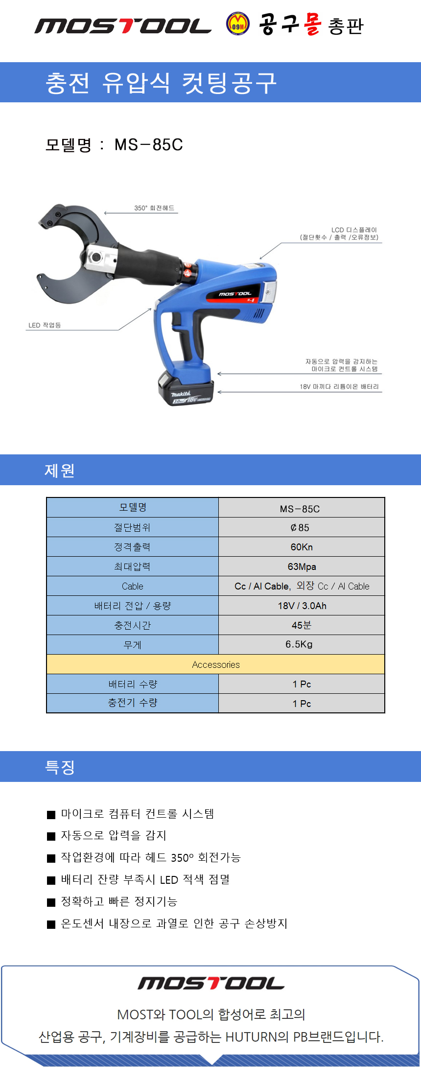 충전 유압식 컷팅공구 MS-85C MOSTOOL,MS85C,케이블커터,케이블컷팅,유압컷팅기