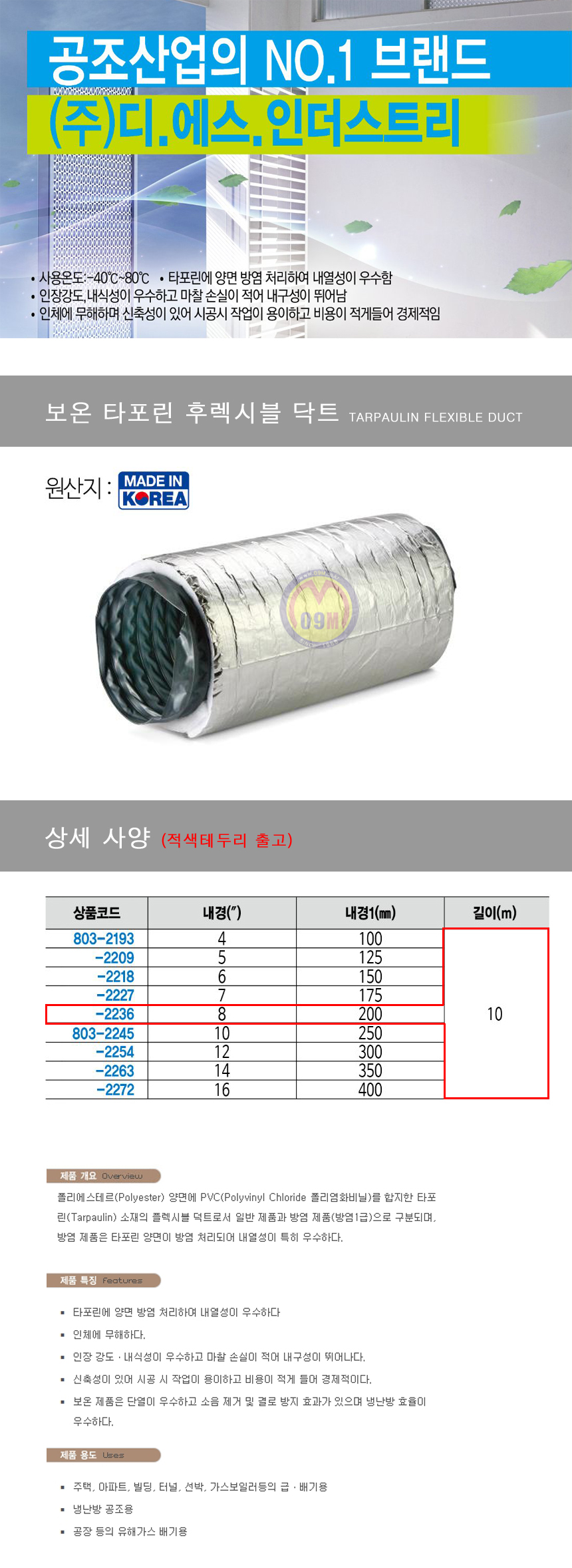 보온 타포린 후렉시블 닥트 250mm 디에스인더스트리,공구몰,내열성우수,8032245