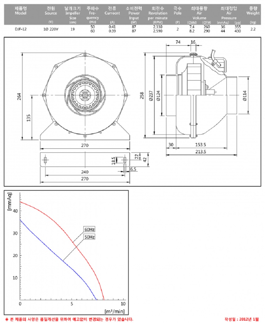DJF-12 제품설명 ◈ 제품 특징 • 유체역학적 터보형 사류날개 및 소음을 극소화 시킨 외형 설계 • 가볍고 구조가 견고하며 방진고무가 부착된 고정부로 진동전달 차단 및 시공이 용이 • 원형덕트 접속형 송풍기에 사용하도록 설계되어, 원심력에서 축류로의 변환을 이어주기 위해 특별히 개발 된 FAN사용 • 기체의 이송거리가 먼 곳에 중간 이송형으로 사용 • 원형 접속배관(덕트)과 직접 연결되는 구조로 설치공간이 충분하지 않은 장소에 적합