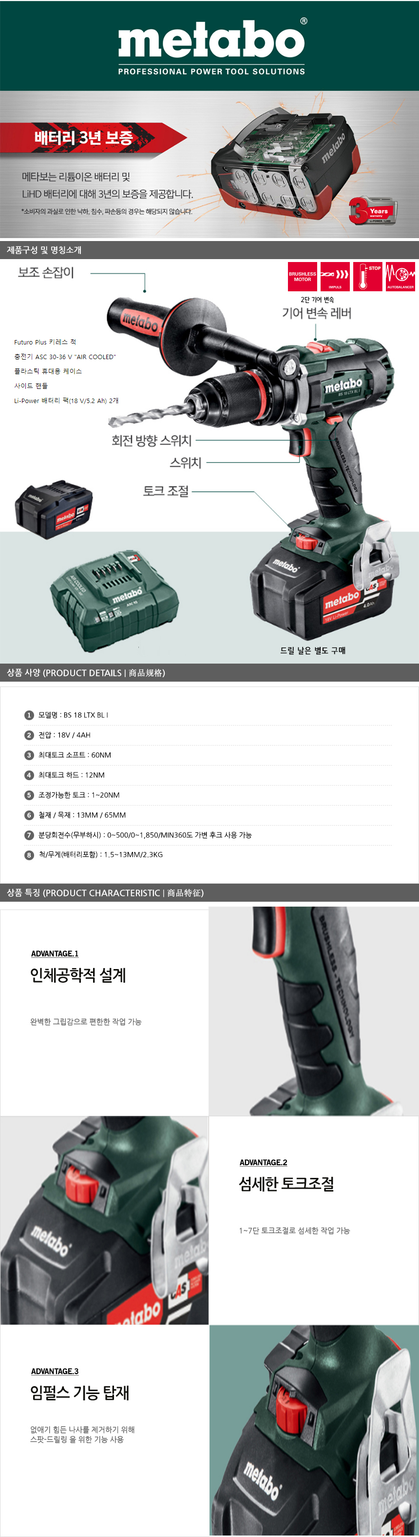 메타보 충전드릴 드라이버 BS 18 LTX BL I, 18V, METABO, 충전드라이버,602358840
