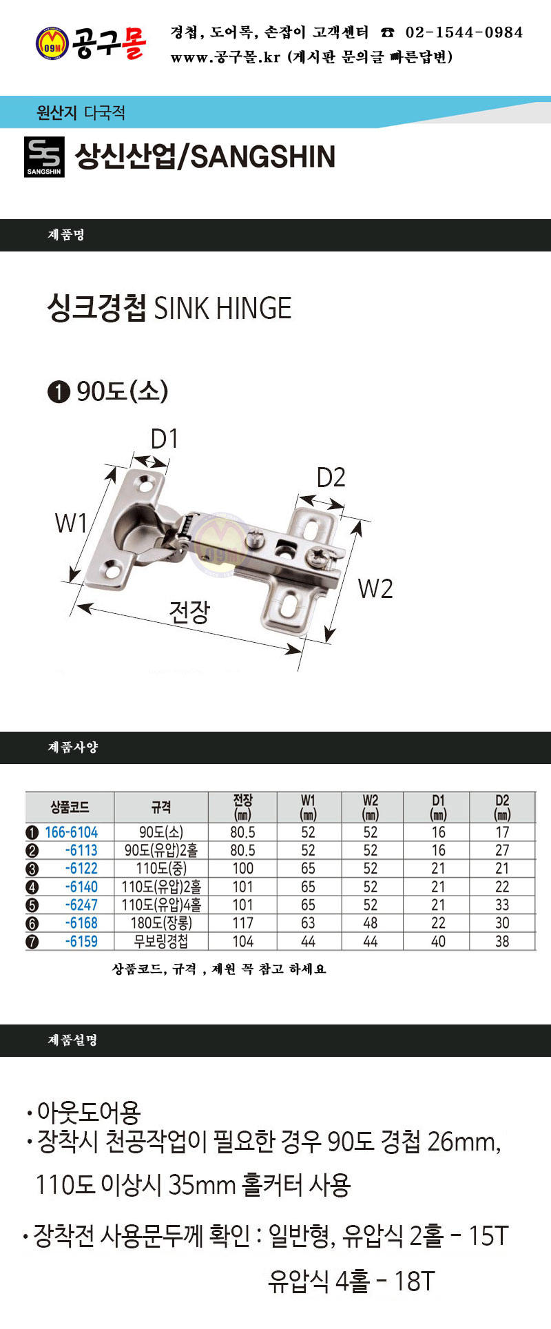 씽크경첩(3) 110도(중) 35mm 천공, 상신산업,1666122