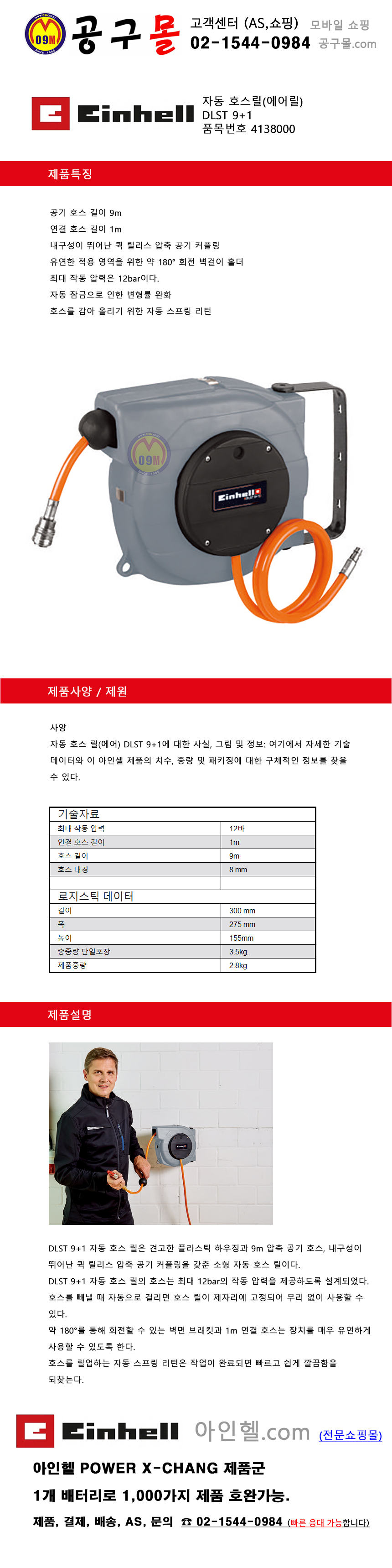 아인헬 자동 호스릴(에어릴) DLST9+1, einhell. 공구몰, 에어오토릴, 코리아, 4138000