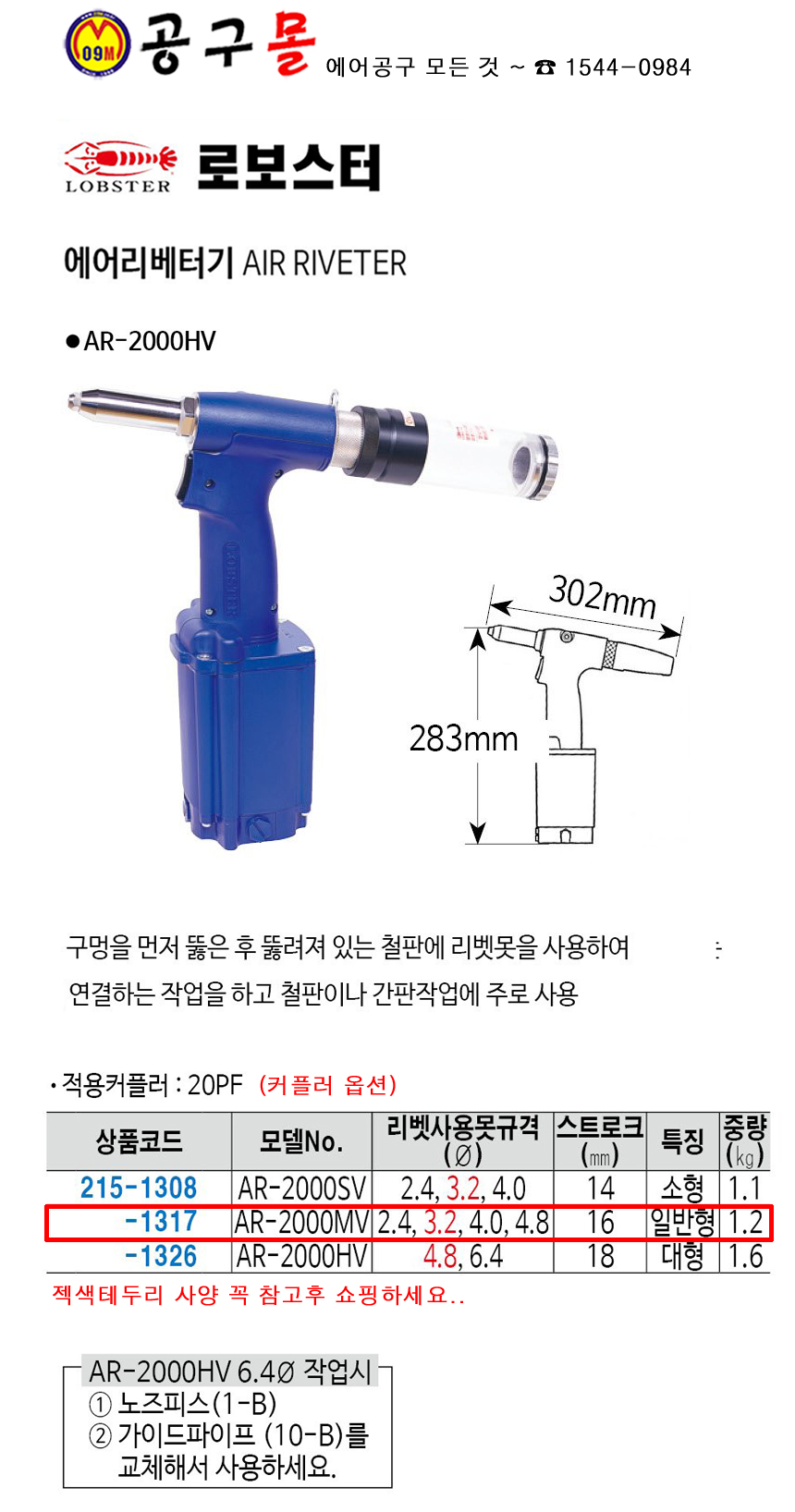 에어리벳트기 AR-2000HV (6.4) LOBSTER,로보스터,공구몰,AR2000HV,215-1326