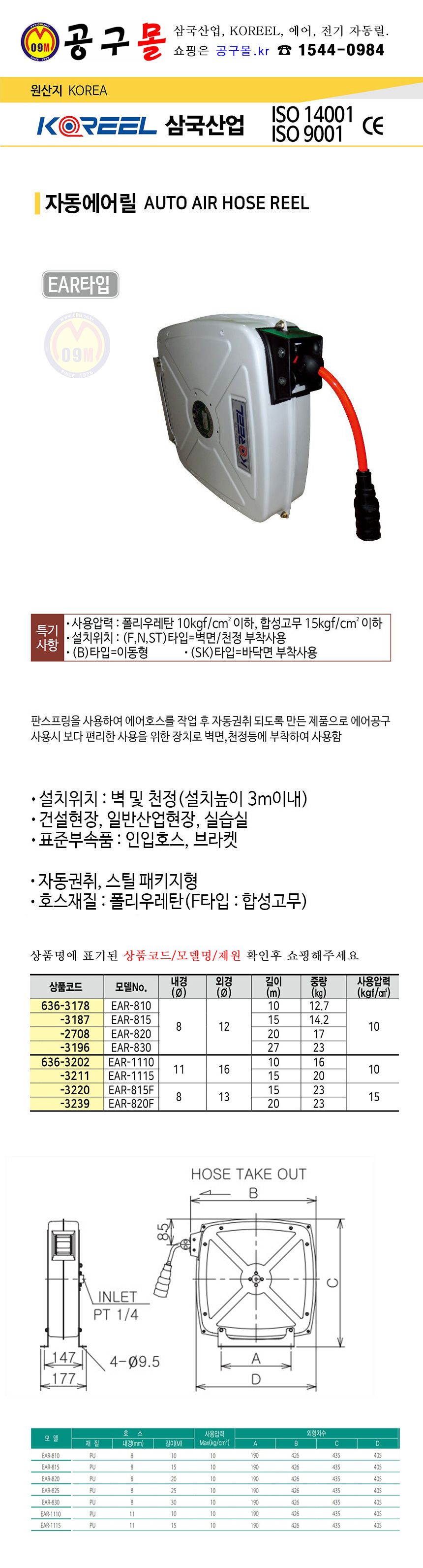자동에어릴(패키지릴) EAR-830 삼국산업, KOREEL, 공구몰, 자동릴, 636-3196