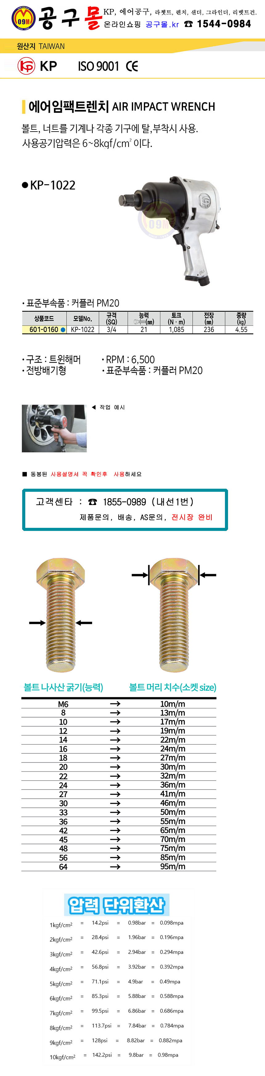 KP 에어임팩트렌치 KP-1022(3/4SQ)권총형 에어공구, 임팩트렌치, 에어렌치, 공구몰 601-0160