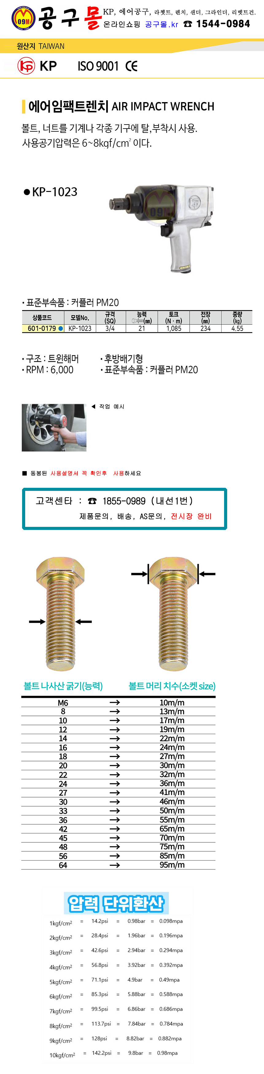 KP 에어임팩트렌치 KP-1023(3/4SQ)권총형 에어공구, 임팩트렌치, 에어렌치, 공구몰 601-0179