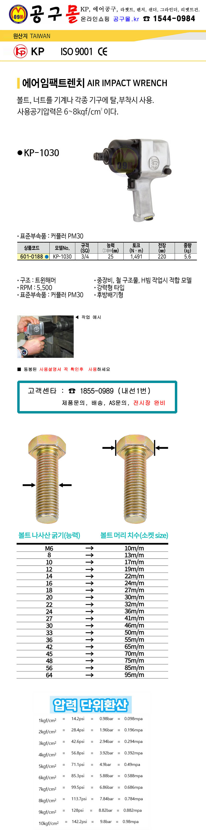 KP 에어임팩트렌치 KP-1030(3/4SQ)권총형 에어공구, 임팩트렌치, 에어렌치, 공구몰 601-0188