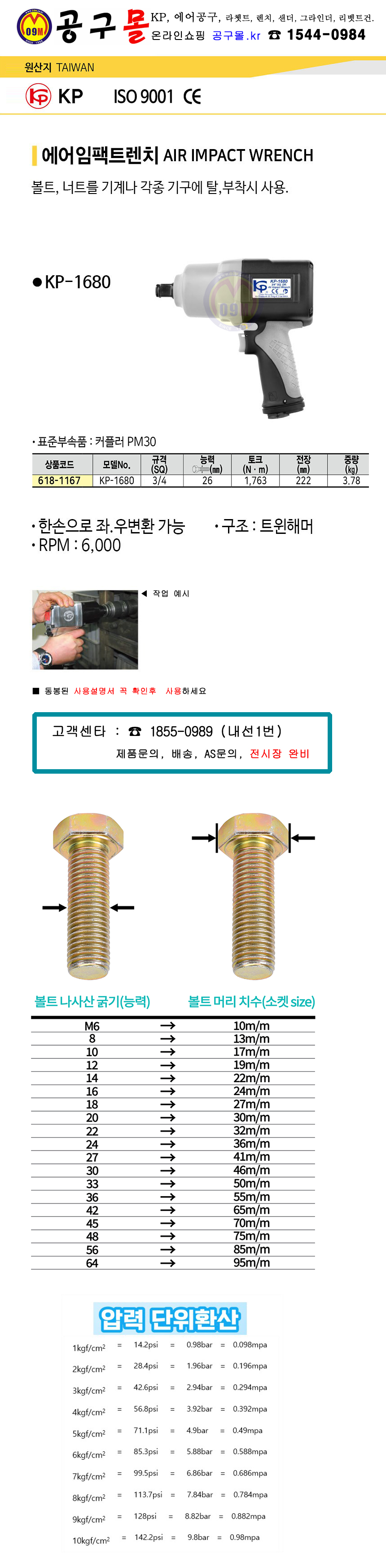 KP 에어임팩트렌치 KP-1680(3/4SQ)권총형 에어공구, 임팩트렌치, 에어렌치, 공구몰 618-1167