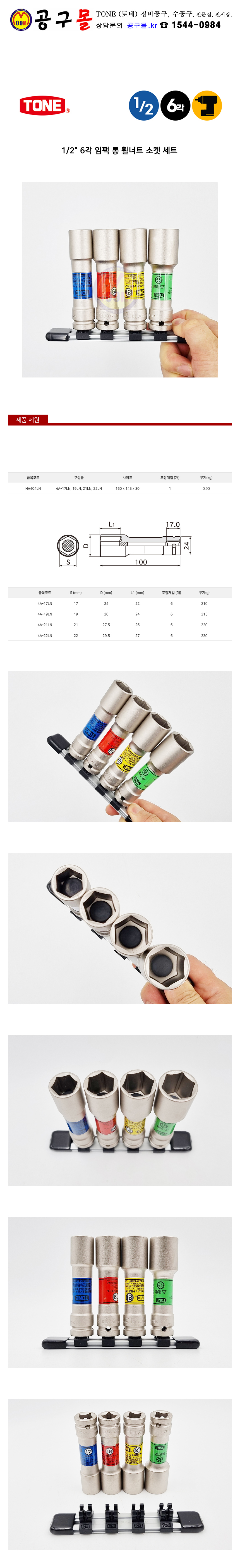 TONE 1/2-6각 임팩 롱 휠 너트소켓 세트(4pcs) 토네, 타이어 복스알, 공구몰, HA404LN