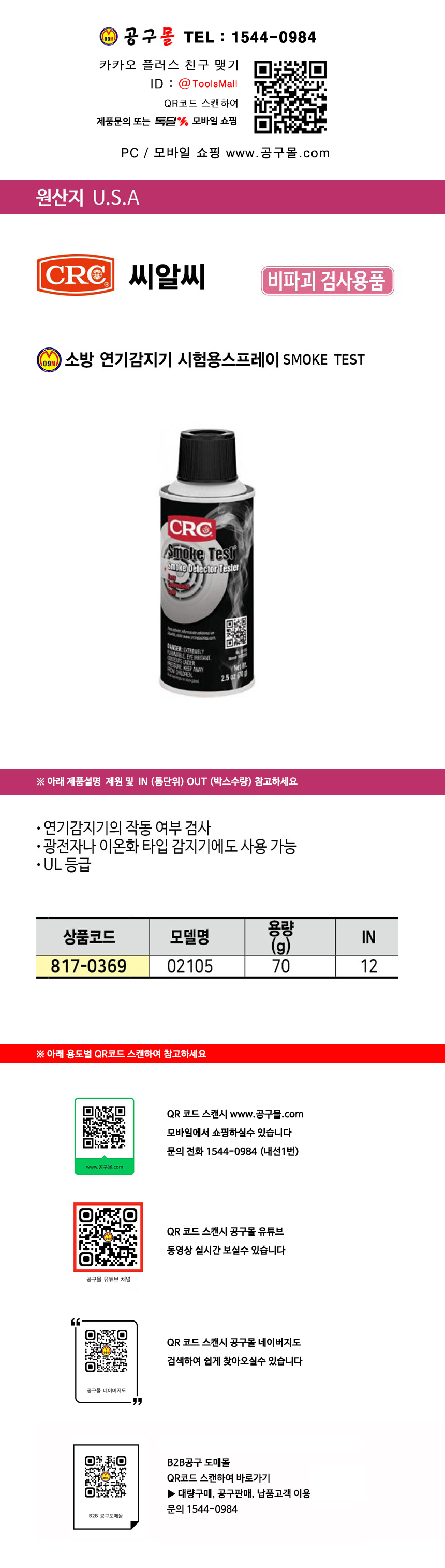 CRC 연기감지기 작동시험용 스프레이 02105/ 70g 스모크테스트 씨알씨 울산 공구몰닷컴 817-0369