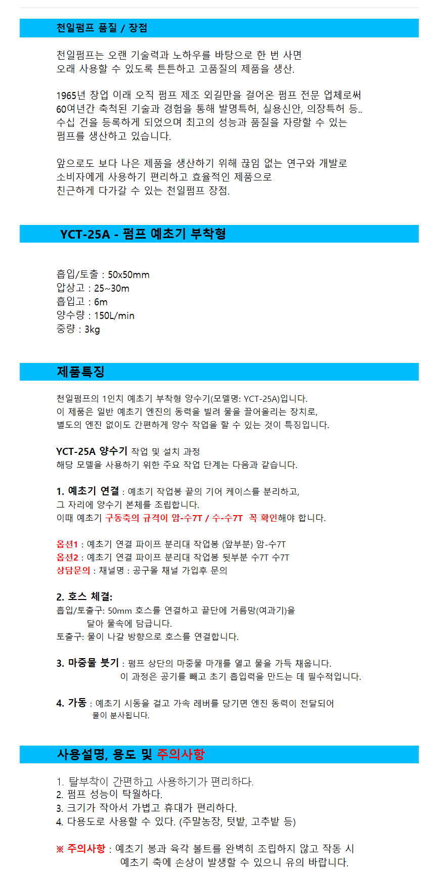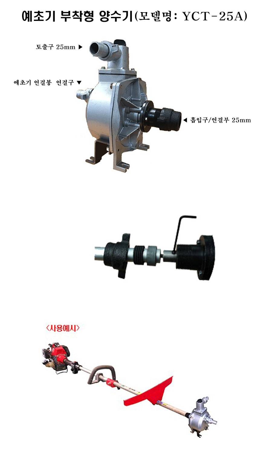예초기 부착형펌프 YCT-25A 흡입/토출 50x50mm 흡입고 6M 천일펌프