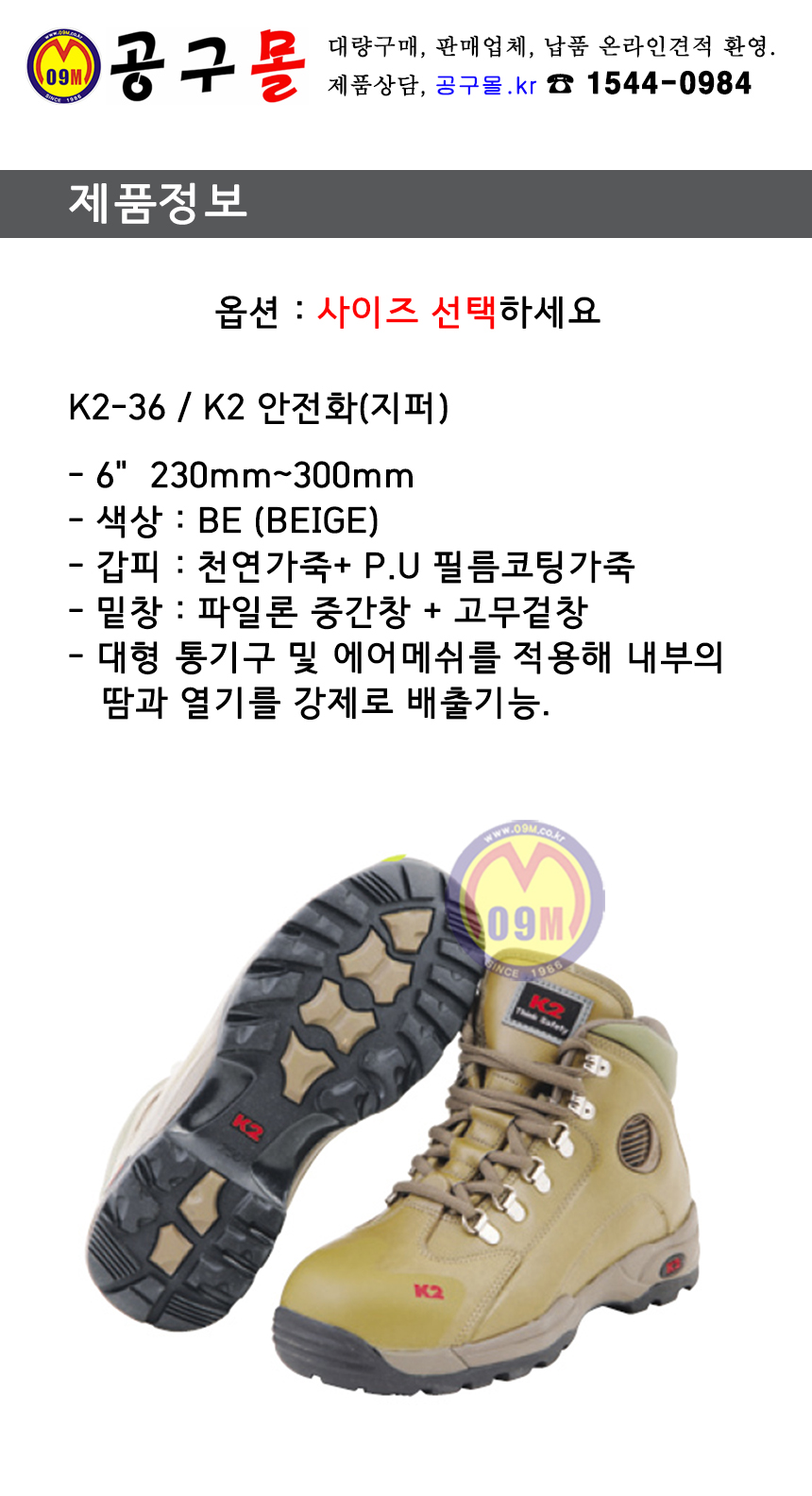 K2 안전화(6)150mm,지퍼) K2-36 (BEIGE, 230mm-300mm) 케이투코리아, 안전용품, 공구몰, W846-8097
