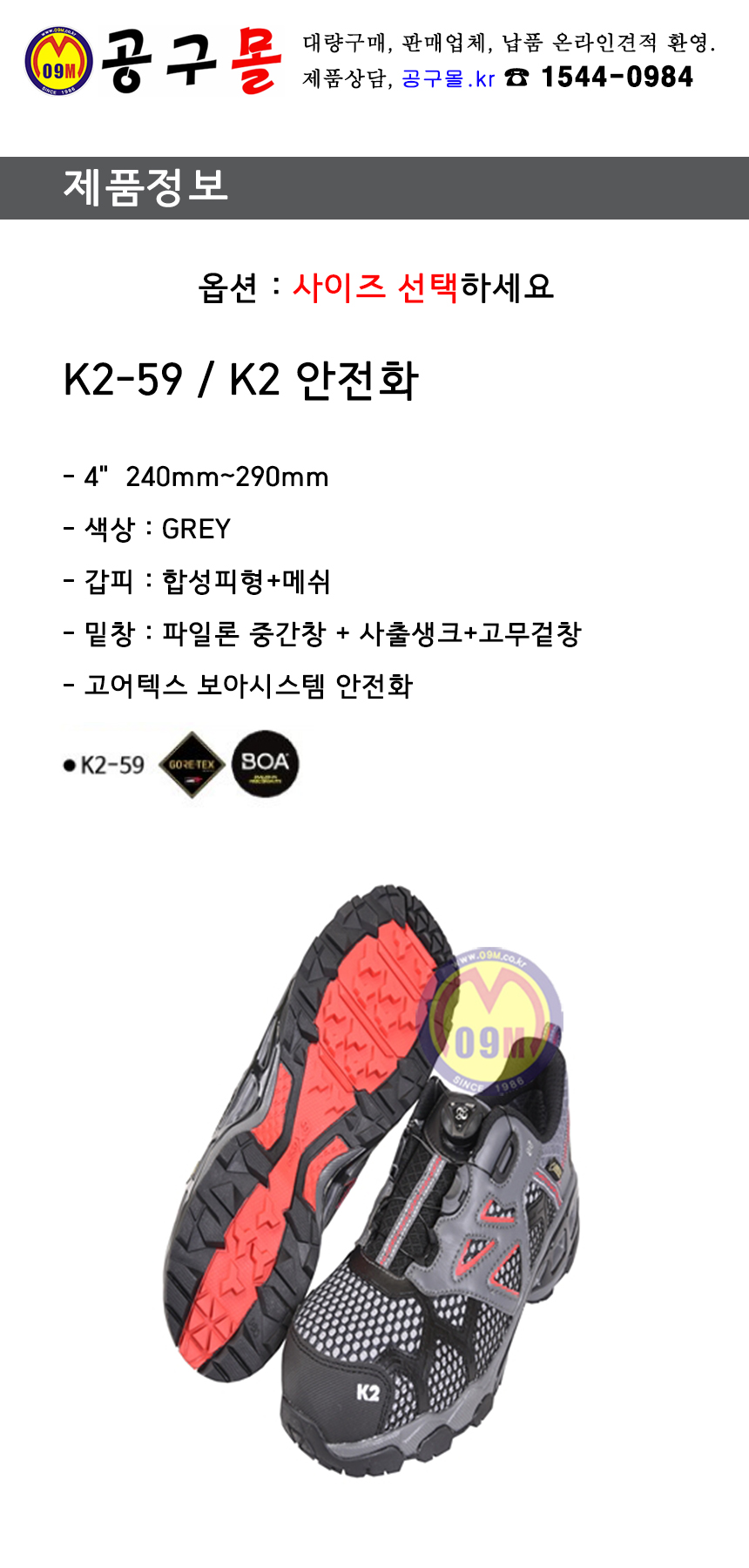 K2 안전화(4)100mm,다이얼) K2-59 (그레이, 240-290mm) 고어텍스, 케이투코리아, 안전용품, 공구몰, W846-8228