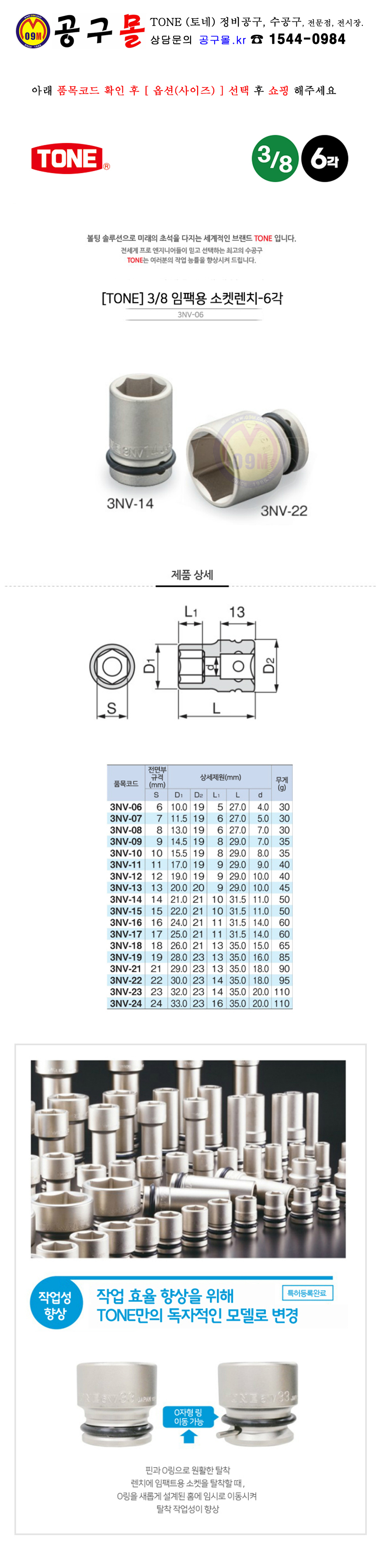 TONE 3/8-6각 임팩소켓(27-35mm) 3NV-06/24 (6-24mm) 토네, 임팩복스알, 공구몰, 3NV-06