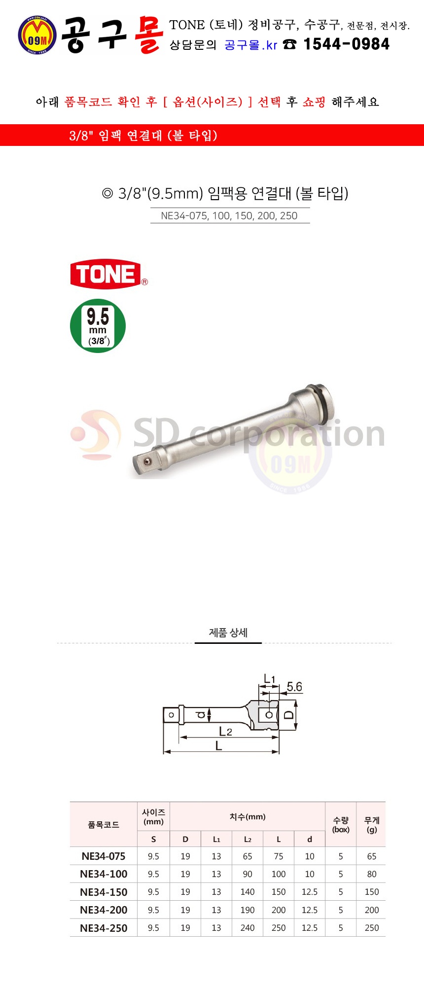 TONE 3/8 임팩 연결대(볼타입) 토네, 공구몰, NE34-075, NE34-100, NE34-150, NE34-200, NE34-250