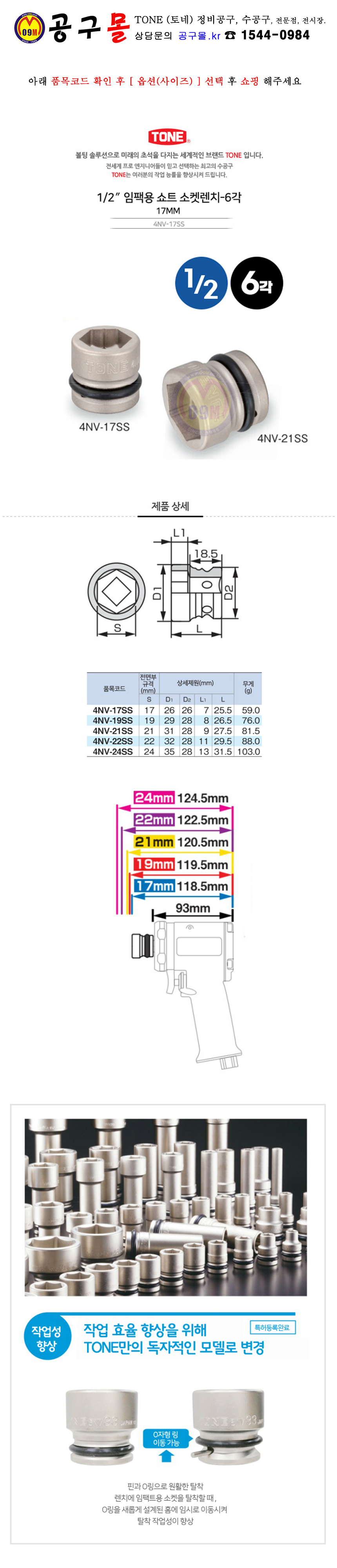 TONE 1/2-6각 임팩 숏 소켓(25.5-31.5mm) 4NV-17SS/24SS (17-24mm) 토네, 임팩복스알, 공구몰