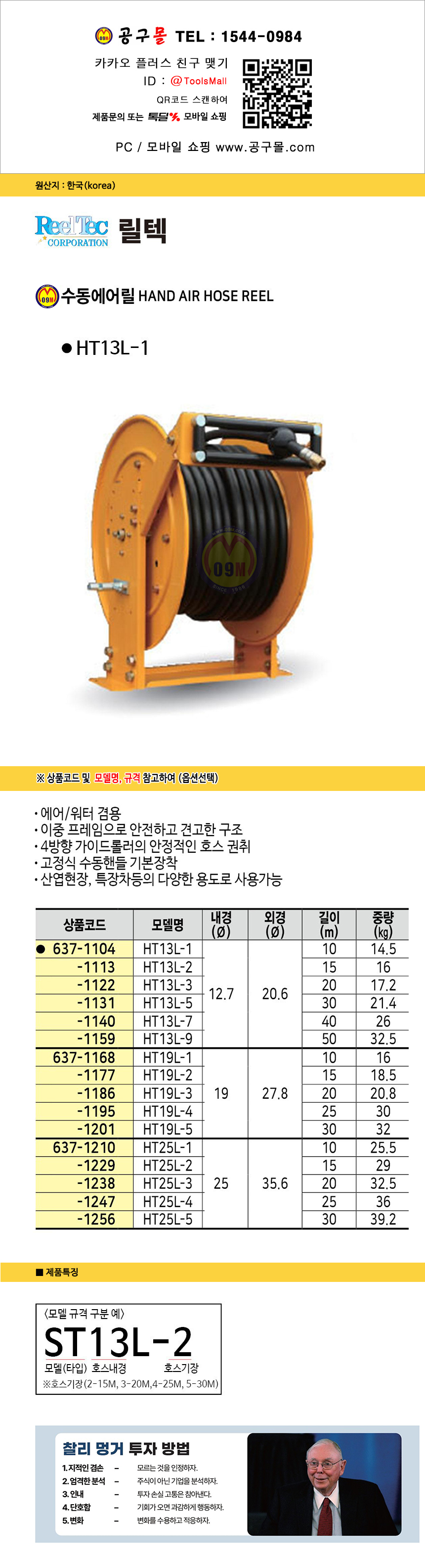 릴텍 수동 에어릴(워터릴)겸용 HT13L-1 / HT25L-5 에어호스릴 물호스릴, 공구몰닷컴 637-1131