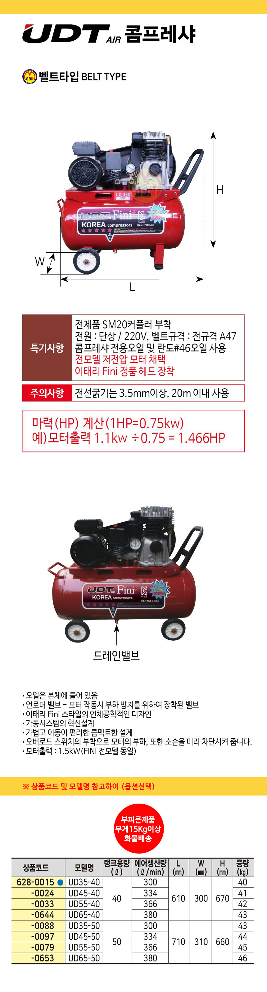 UDT 콤프레샤(벨트타입) UD35-40/ UD65-50 40Kg-46Kg 공구몰 628-0015