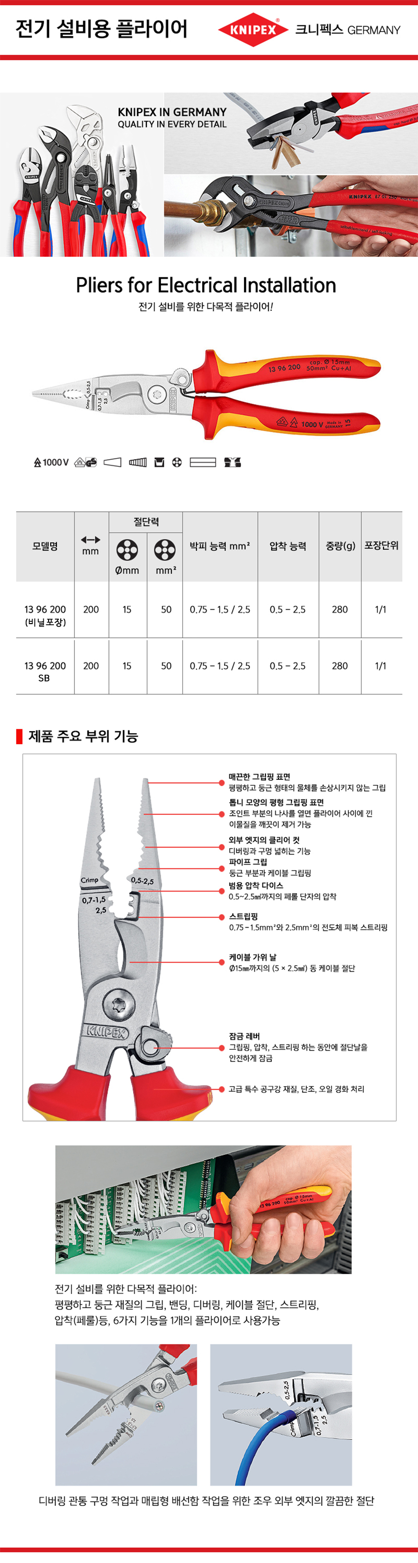 크니펙스 플라이어(만능,절연) 13-96-200, 13-96-200SB Knipex 공구몰 101001020025