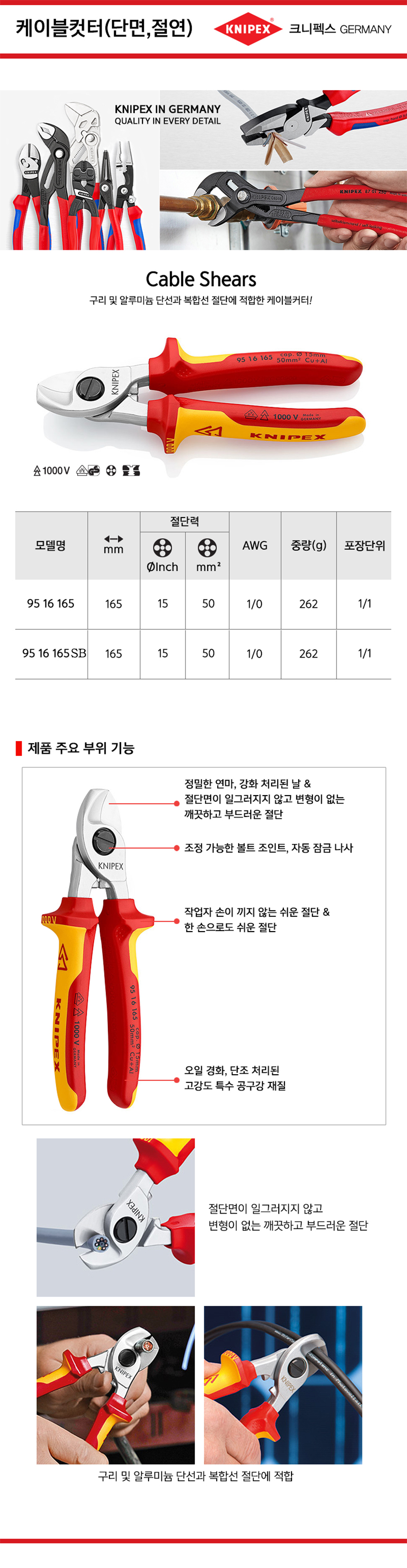 크니펙스 케이블컷터(단면,절연) 95-16-165, 95-16-165SB 전선커터 KNIPEX 독일공구, 수공구, 공구몰추천 101011510016