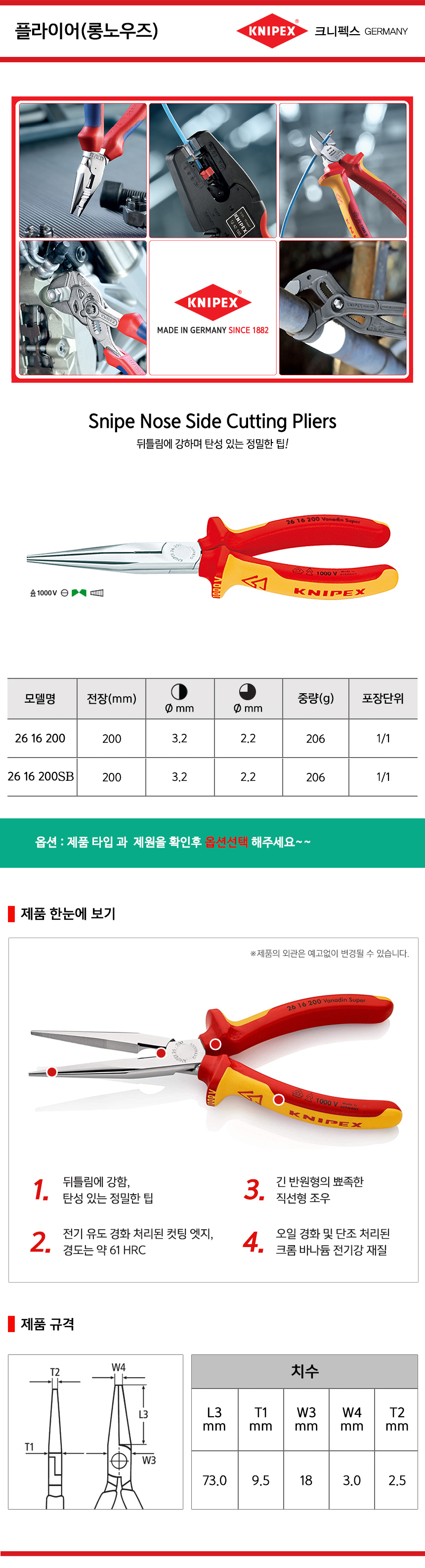 크니펙스 플라이어(롱노우즈,절연) 26-15-200, 26-15-200SB Knipex 독일공구, 공구몰 101001020087