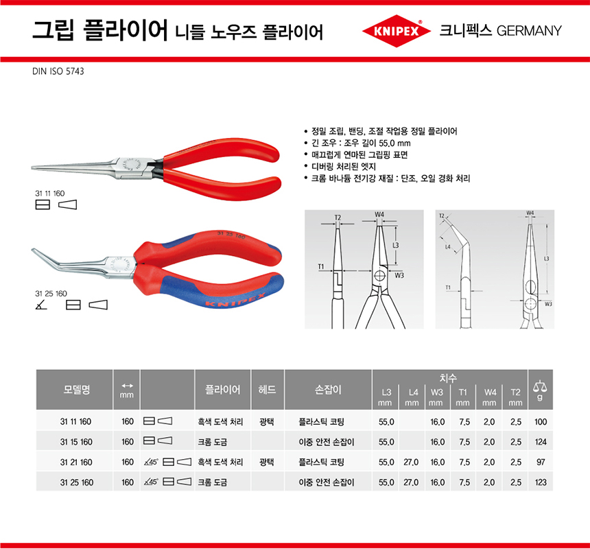 크니펙스 플라이어(롱노우즈) 31-21-160, 31-21-160SB KNIPEX 독일공구, 수공구, 공구몰추천 101001020150