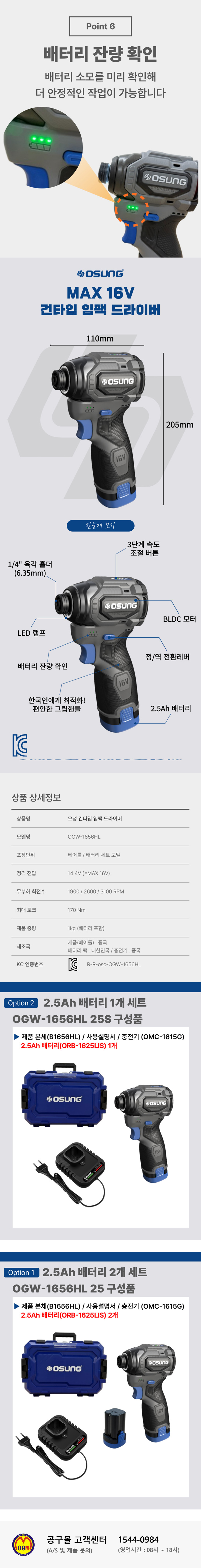 오성 16V 충전임팩드라이버 OGW-1656HL (16V-세트) 충전임팩 건타입