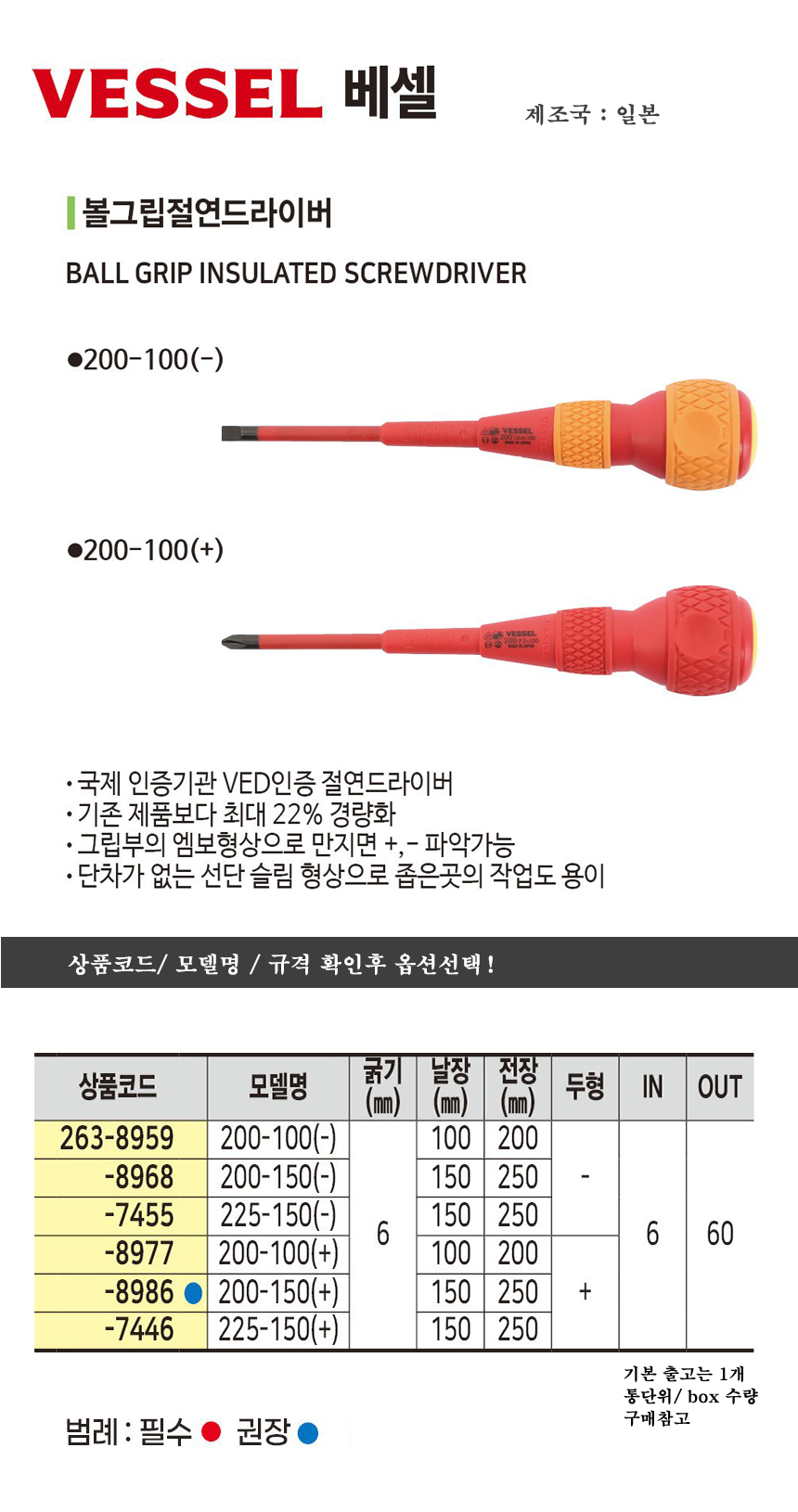 베셀 볼그립 절연/전공드라이버 200 일자100mm/ 십자150mm VESSEL, 공구몰