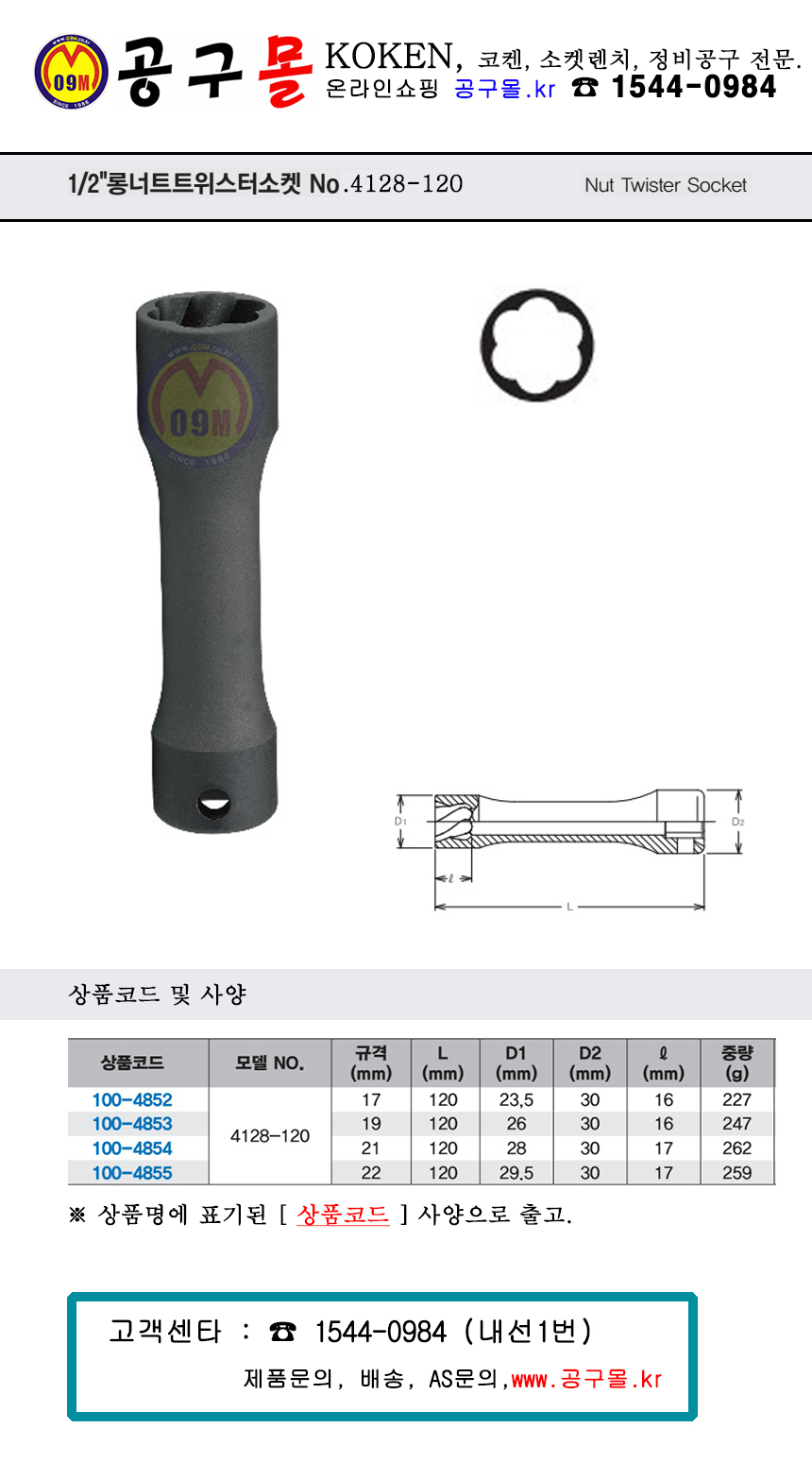 코켄 롱너트 트위스터소켓 4128-L120 1/2(17mm, 22mm) KOKEN, 복스알,100-4852